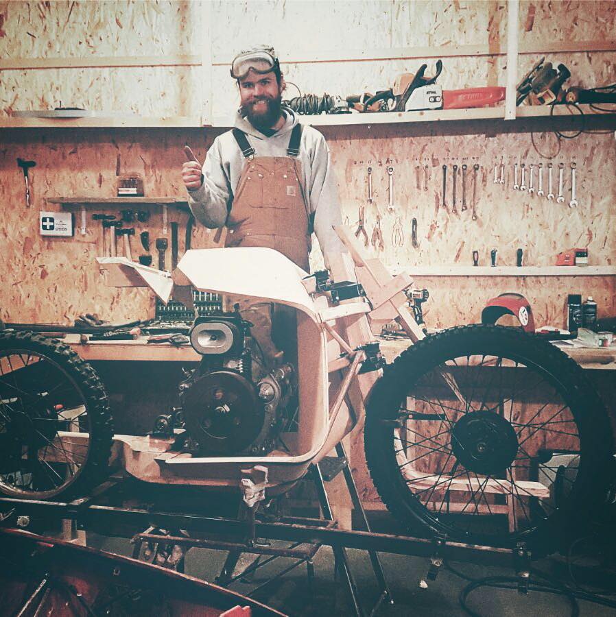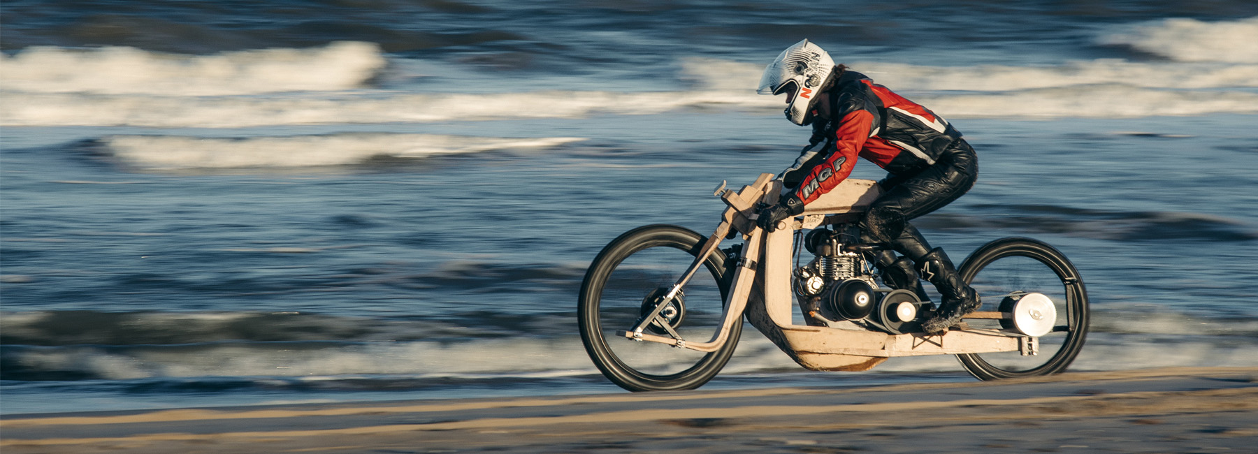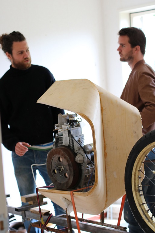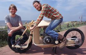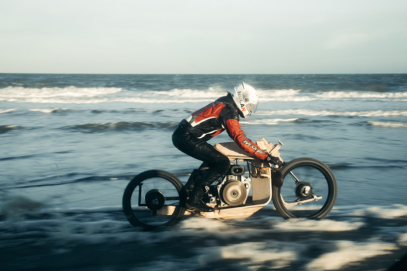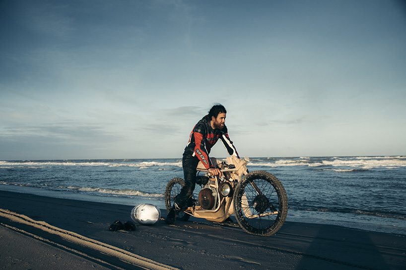 Ritsert décide d’employer la même philosophie écologique que Peter. Utiliser et promouvoir au maximum des matériaux et process que la nature lui fournit directement. Dans son petit atelier, et sans utiliser un seul ordinateur, le designer développe de manière empirique plusieurs prototypes de moto. Il utilise les propriétés du bois et du liège pour la fourche mono-bras, le châssis, les ressorts et petits contenants, et du bio-composite de chanvre pour les renforts. Et le résultat est iconique et saisissant, bousculant l’archétype de la moto.