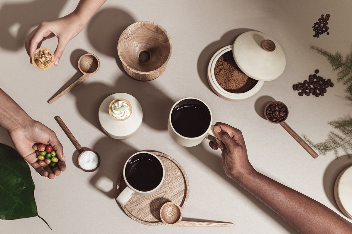 Les accessoires du projet Samaná, quant à eux, visent à opérer un certain rituel à travers chaque ustensile. L’importance de préparer le café selon la méthode traditionnelle est reprise en faisant appel à la dextérité de l’utilisateur. Le bois de chêne amène texture et chaleur à la forme globale de chaque pièce, générant une expérience différente. La céramique, elle, en cours d’émaillage dans le café, donne une touche unique aux différentes pièces. En effet, en utilisant différents grains et charges, la teinte de l’émail est modifiée.