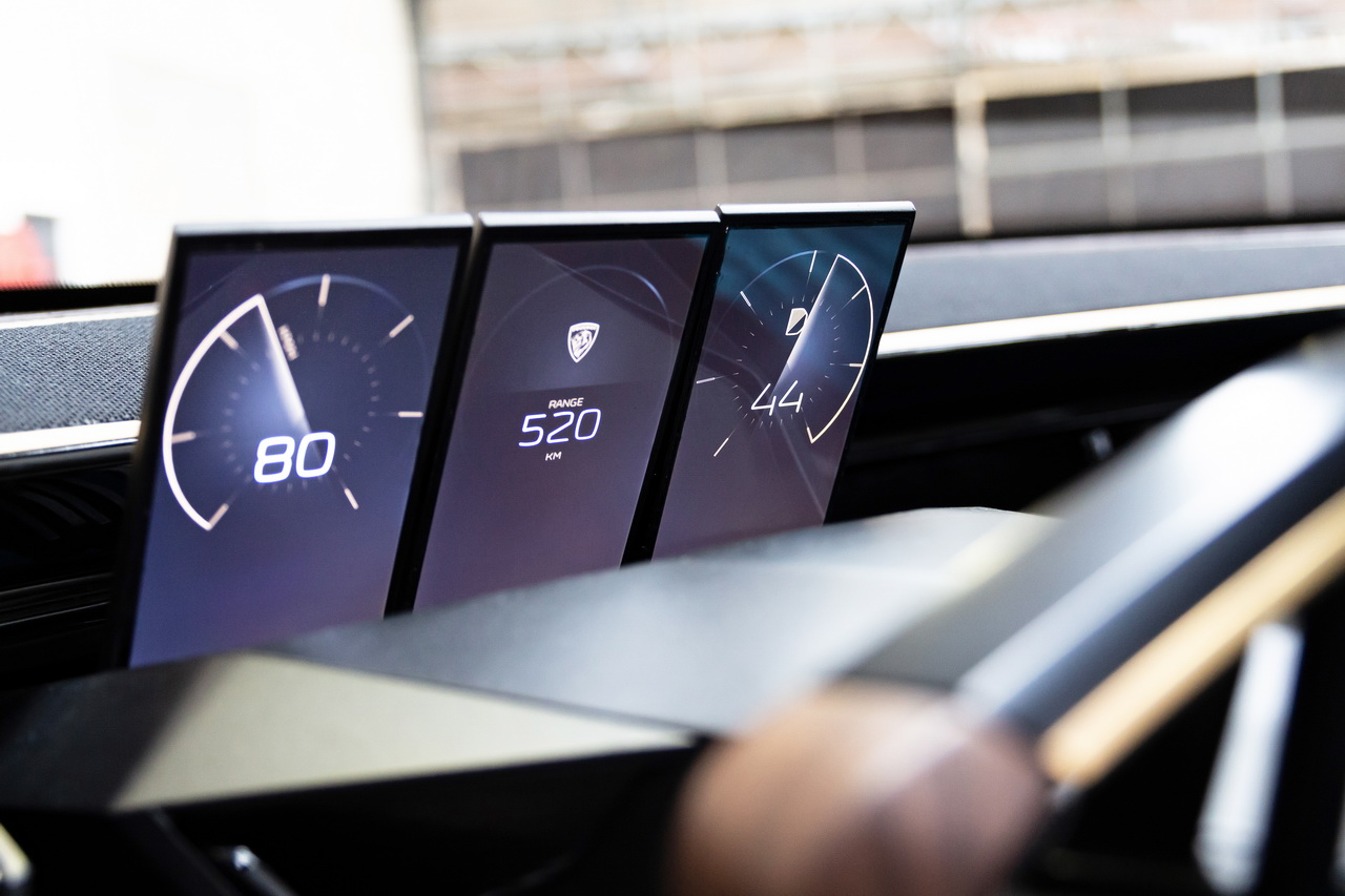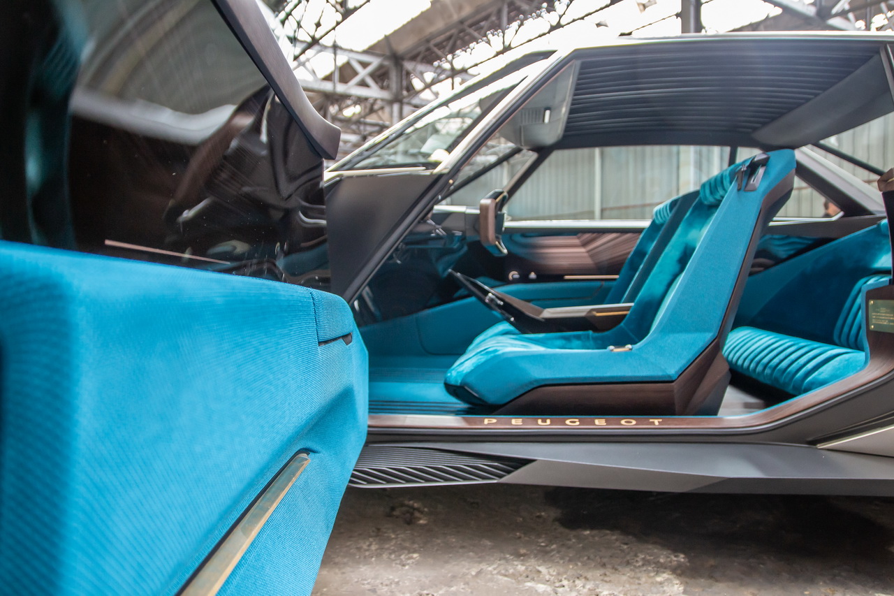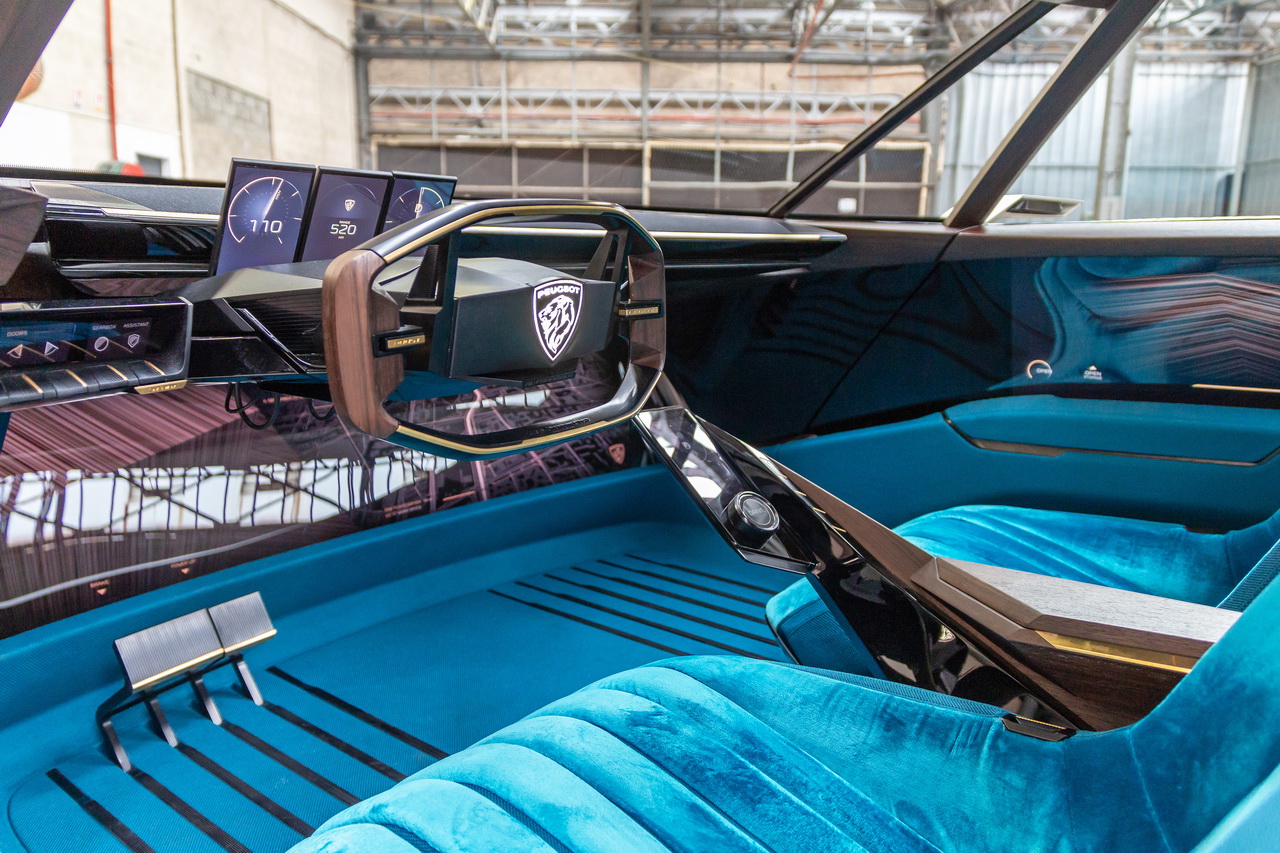 Si à l’extérieur nous sommes sur une évolution, actualisation du passé que nous apprécions, à l’intérieur nous sommes directement projetés dans le futur… Le velours bleu invite à la découverte d’un environnement intérieur connecté, écran et ensemble des commandes sont tactiles. Le volant et autres aides à la conduite disparaissent lorsque la voiture passe en autonome, car oui la voiture est bien électrique et autonome. Un modèle de 460ch pour environ 600km d’autonomie.