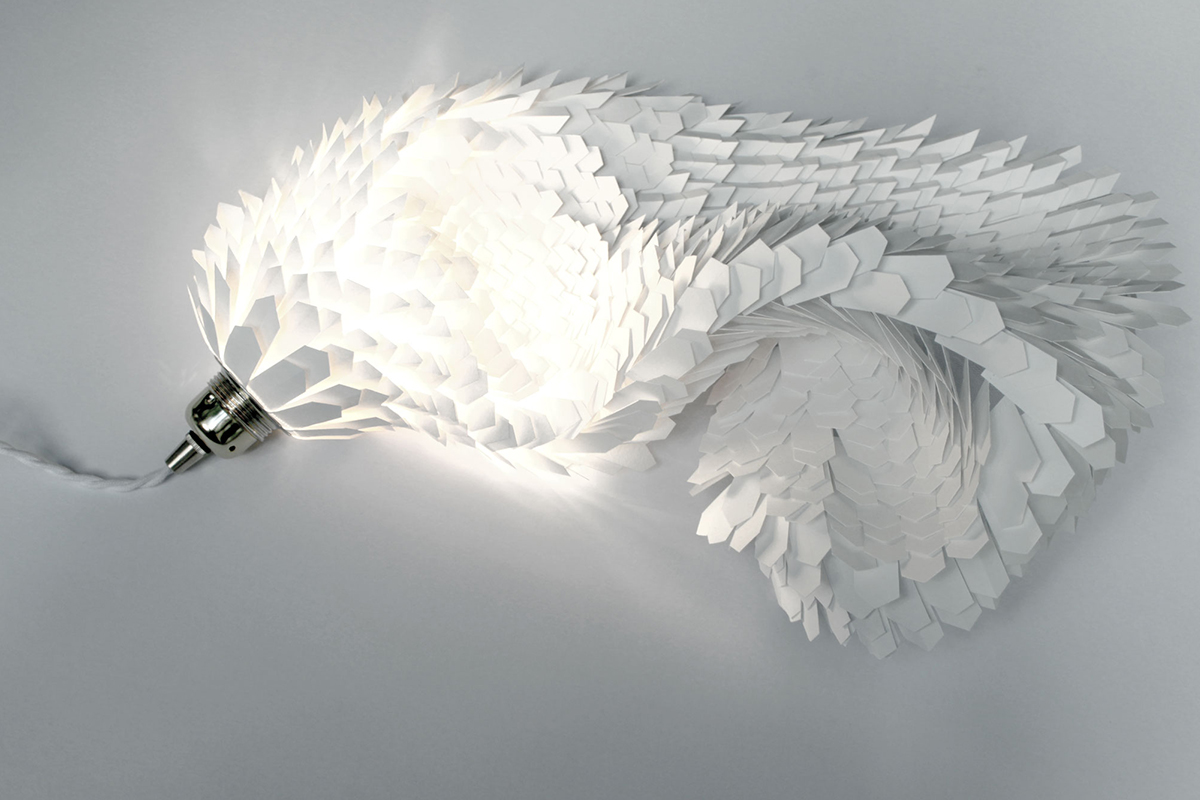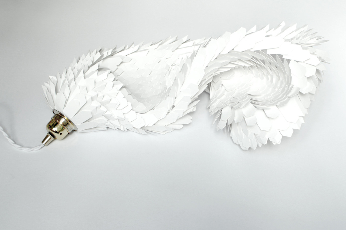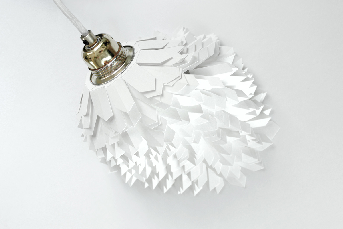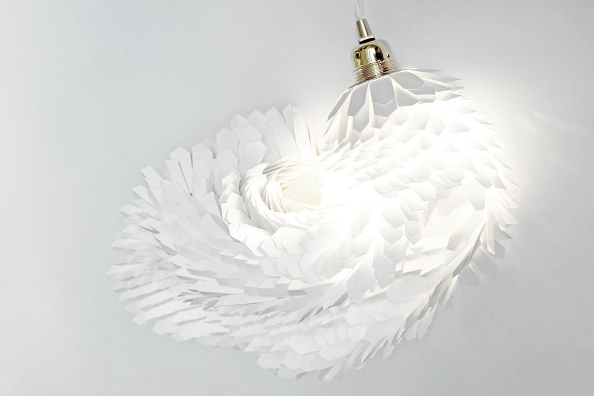 « J’ai choisi de sublimer en sculptant…lui donner vie à travers des plis, des bas reliefs. Tenter à répétition d’inclure les limites. La partie belle à la lumière, qui s’est associée au papier, s’est émancipée des parois, s’est transformée en un objet fonctionnel, un luminaire. Une influence esthétique que je puise essentiellement dans la nature, les abysses, les invertébrés dont la finesse des lignes et les membranes laisse transparaître la lumière« .
