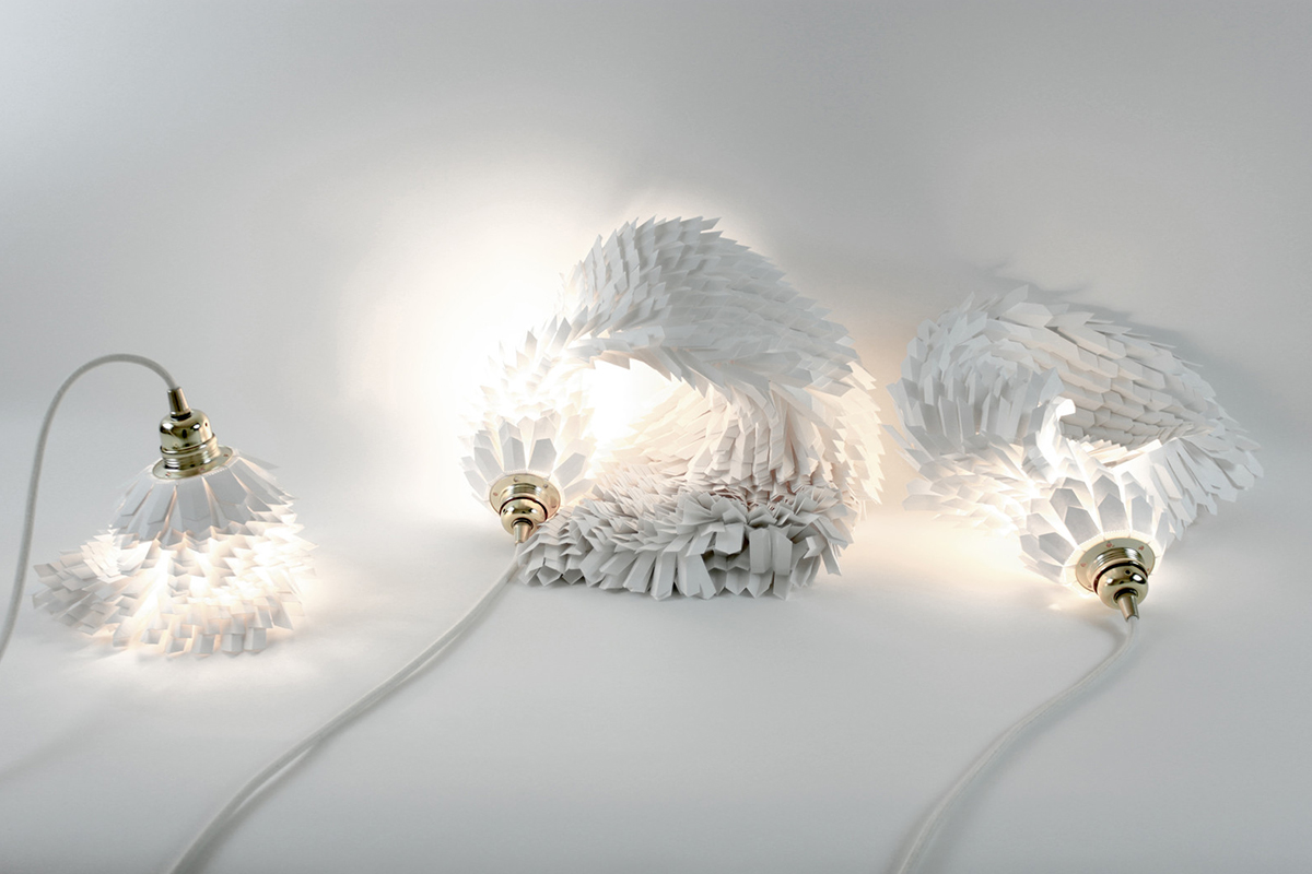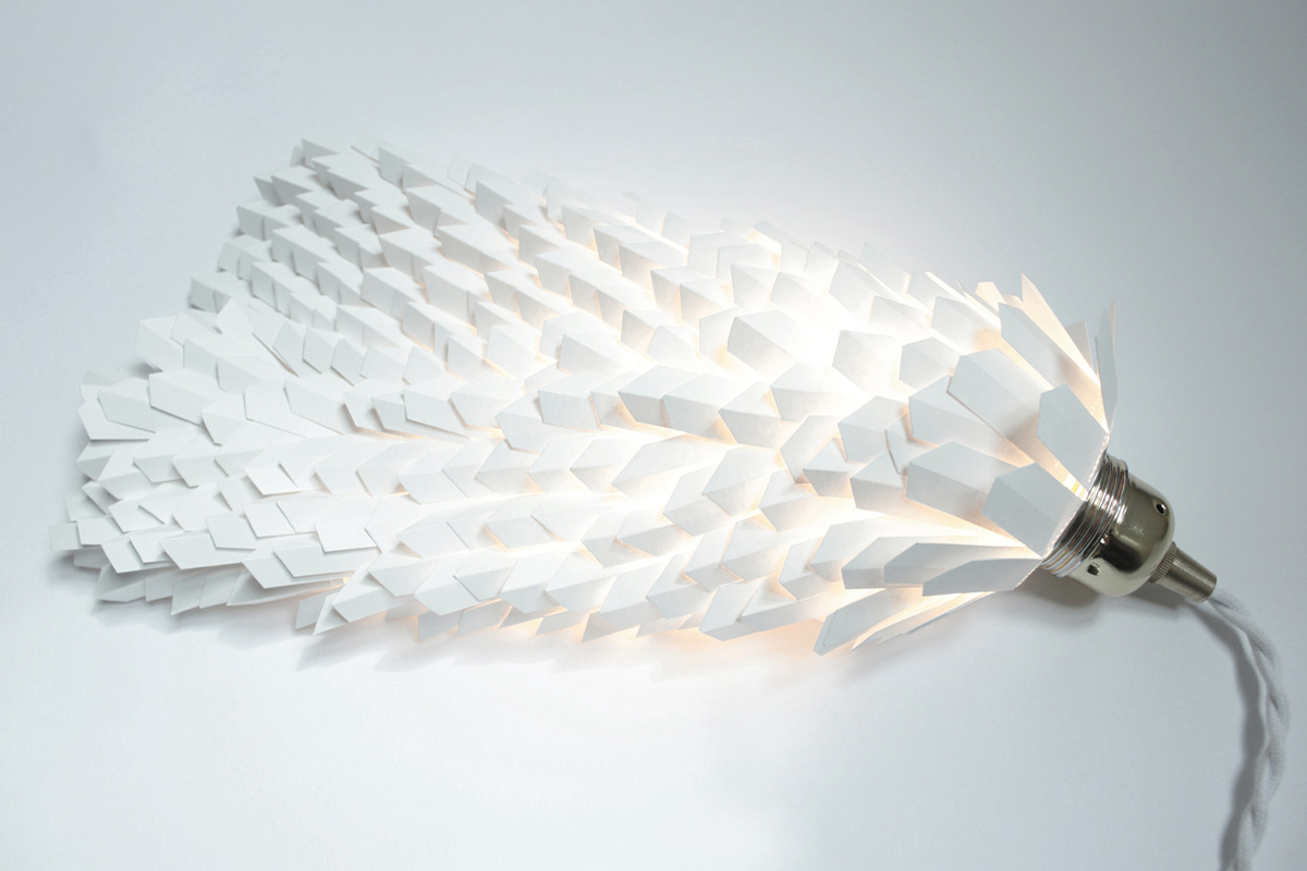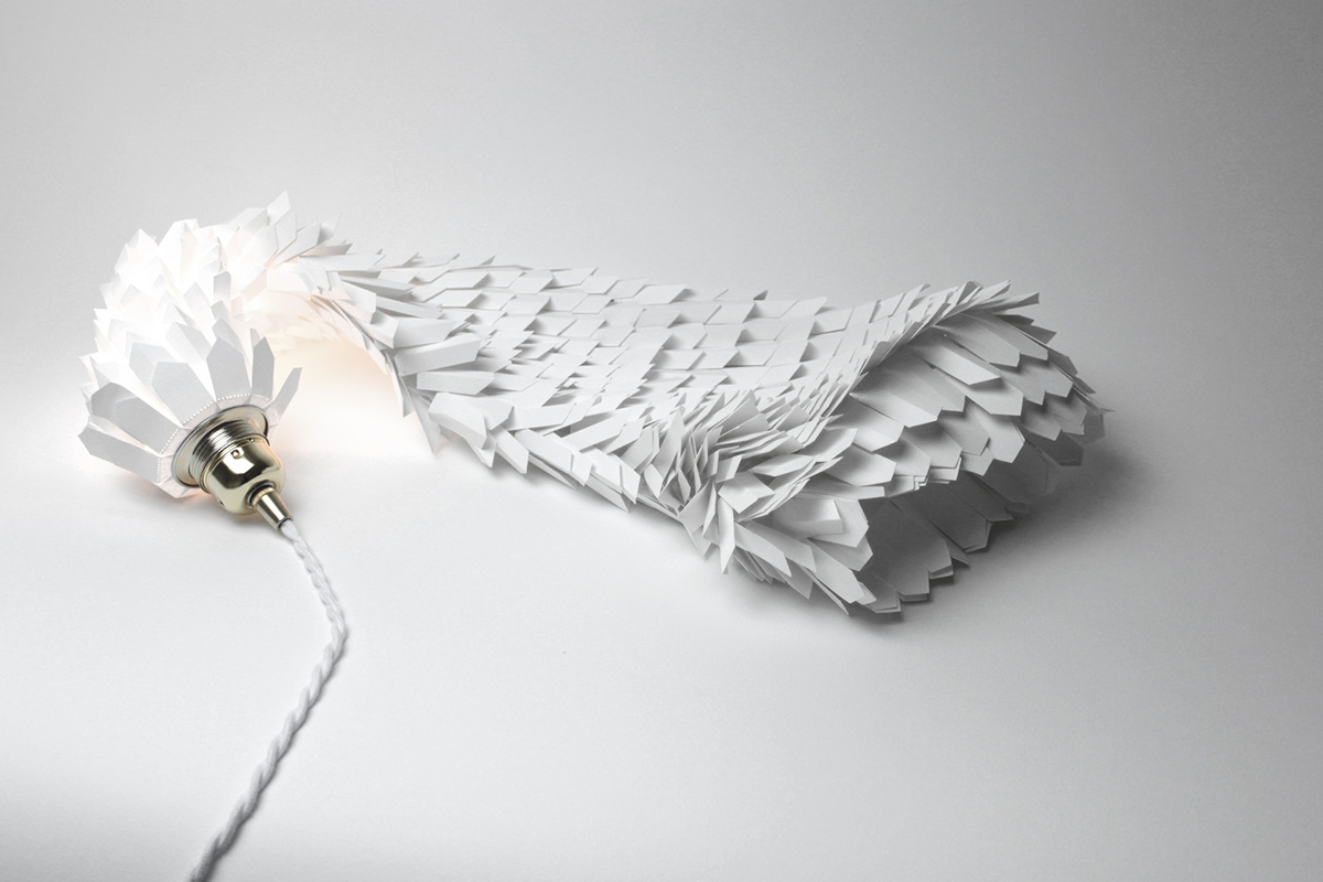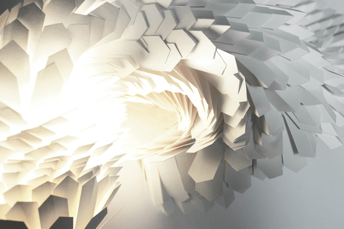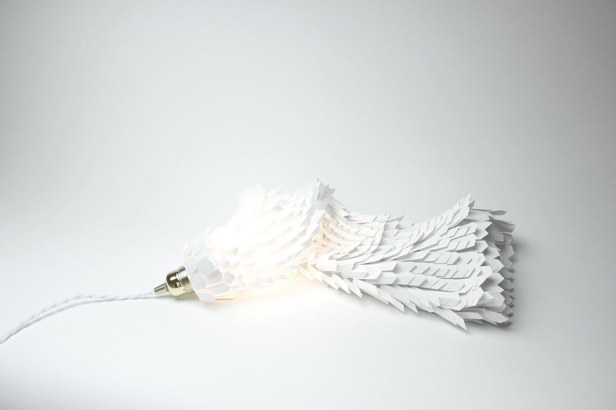« J’ai choisi de sublimer en sculptant…lui donner vie à travers des plis, des bas reliefs. Tenter à répétition d’inclure les limites. La partie belle à la lumière, qui s’est associée au papier, s’est émancipée des parois, s’est transformée en un objet fonctionnel, un luminaire. Une influence esthétique que je puise essentiellement dans la nature, les abysses, les invertébrés dont la finesse des lignes et les membranes laisse transparaître la lumière« .
