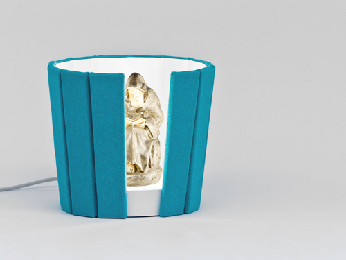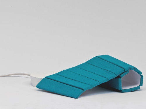 « Leaf nous accompagne, se pose là où on le souhaite de façon simple : dès que la feuille est en contact avec la base la lumière apparaît, l’éclairage devient ainsi mobile, souple et instantané. La face textile est personnalisable pour s’accorder à chaque espace intérieur. La famille Leaf se décline en versions table de chevet, lampe sur pied et applique. »